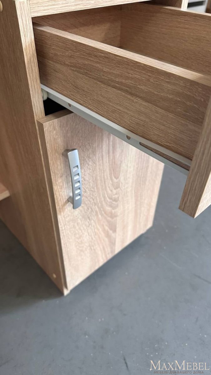 Стол Ровесник является простым и эстетичным вариантом решения проблемы организации рабочего места в детской комнате, выполненным с использованием цвета и фактуры светлой древесины дуба самоа. Просторная столешница и вместительная закрываемая дверцей ниша с выдвижным ящиком предоставляют достаточно пространства для хранения всех письменных принадлежностей.