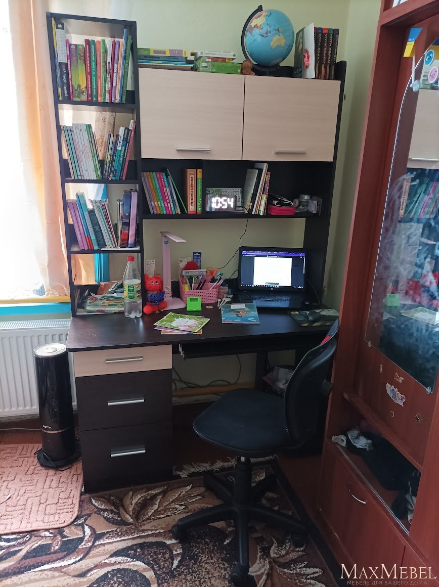 - Надстройка установлена на столешницу. Слева четыре одинаковых открытых емкости для книг, учебников, тетрадей или коллекций ребенка в вертикальном ряду. Правая часть представлена открытой полкой, где можно разместить украшения интерьера, соответствующие возрасту владельца, под полкой расположены две просторные емкости за распашными дверками, ниже - три небольших открытых ниши. Вполне достаточно места для размещения наград в спортивных соревнованиях или иных свидетельств увлечений вашего ученика.