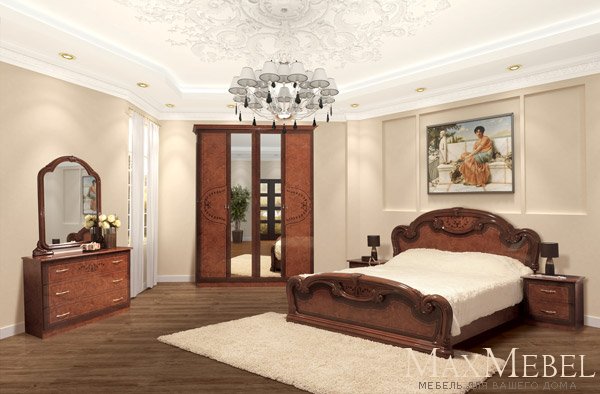 Опера Спальня – утонченный и стильный гарнитур для ценителей прекрасного. Коллекция выполнена в насыщенных древесных оттенках с интересной фактурой дерева. Фасады мебели украшены оригинальными декоративными элементами. Плавность и витиеватость резных форм раскрывают во всем великолепии благородство классического стиля.материал : ДСП