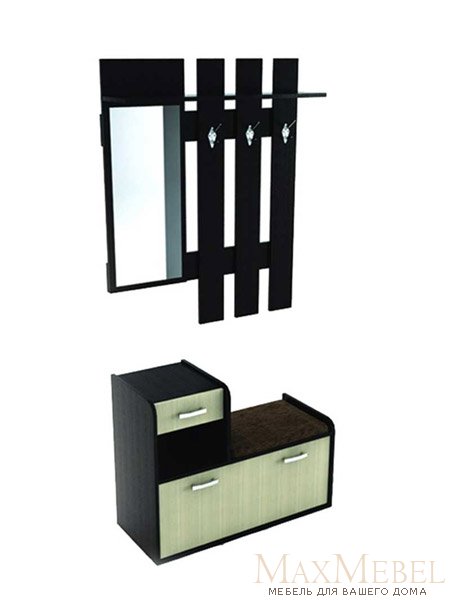Прихожая Тандем – интересное дизайнерское решение для обустройства коридора. Включает два автономных модуля, образующих единый мебельный ансамбль. Отдельно стоящая удобная тумба для обуви с компактным выдвижным ящиком и открытой полкой лаконично дополняется подвесным модулем с вешалкой и полкой для головных уборов.