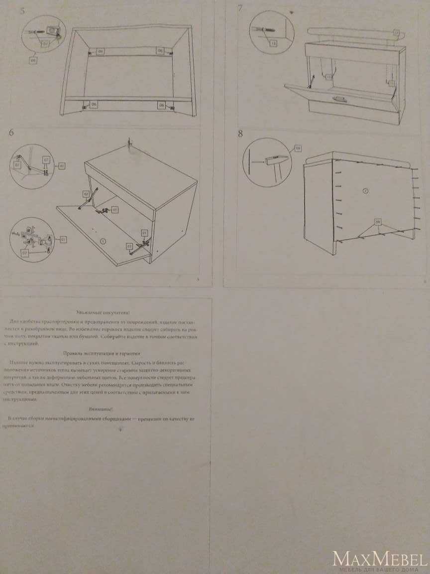 Условия бесплатной замены производителем бракованной детали: если мебель собирается не представителем продавца(в день доставки мебели или максимум на следующий день), то при обнаружении дефекта нужно сразу упаковать деталь в упаковку, в которой она находилась. На упаковочном картоне должна находиться этикетка с маркировкой производителя. Если эти условия будут соблюдены, и на детали не будет следов монтажа, бракованную деталь обменяют бесплатно. В остальных случаях замена детали производится за счет покупателя.