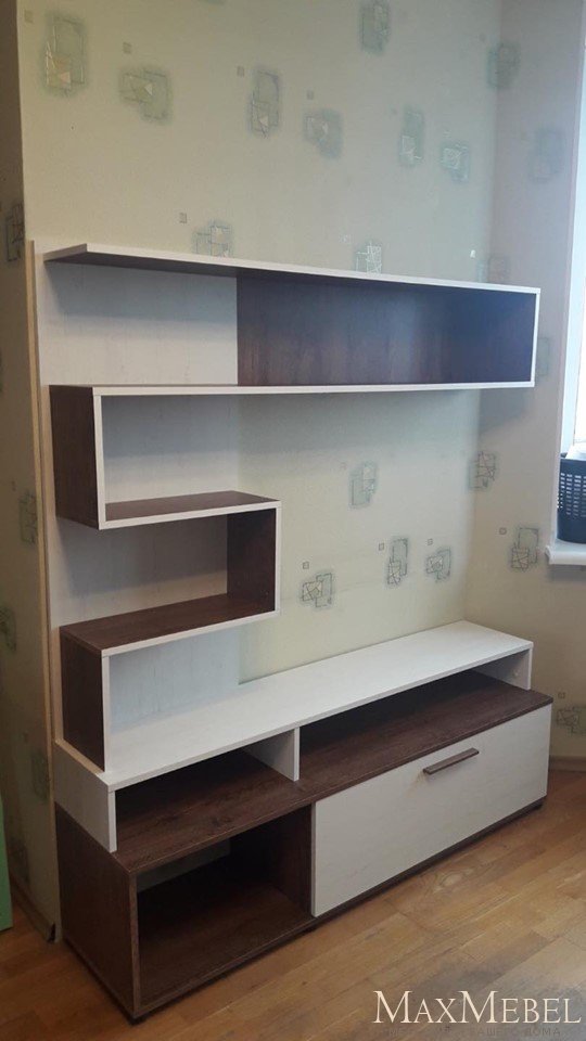 - Слева на тумбочке установлена зигзагообразная полка с задней стенкой, предохраняющей стену комнаты от повреждения, в верхней части полка имеет консольное продолжение параллельно тумбе ТВ, образуя таким образом нишу для телевизора размером 100 х 82 см. На прочных полках можно размещать разнообразные украшения интерьера, книги, вазы, фоторамки - пример на фото в каталоге.