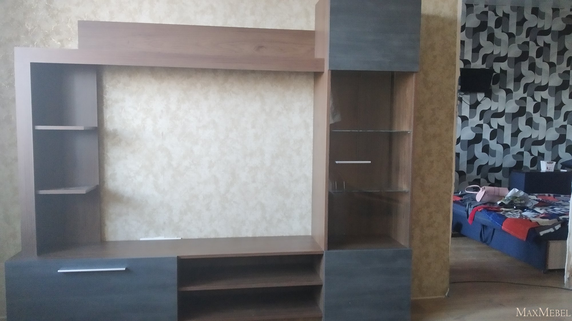 Под нишей для телевизора слева также расположена закрытая вместительная емкость, справа - открытая, разделенная полкой.