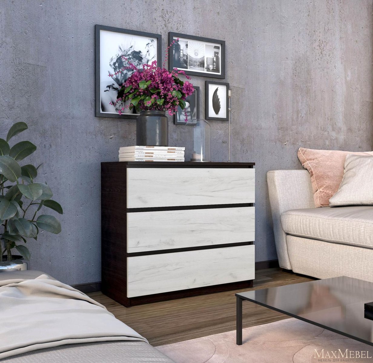 Глибина комода, см: 37.6 Кількість висувних ящиків, шт: 3 Корпус (каркас): ламінована ДСП Стан: Новий Фасади: ламінована ДСП > Форма фасаду: пряма Ширина комода, см: 80 Вага, кг: 27 Матеріал корпусу: Ламінована ДСП Призначення: Для дому Сфера використання: Для дому Форма: Прямокутна Колір: Венге магія / Дуб крафт білий Додайте функціональності та стилю вашому інтер'єру з цим компактним та елегантним комодом!Сучасний комод, виготовлений з ламінованого ДСП, ідеально впишеться в будь-який інтер'єр завдяки своєму мінімалістичному дизайну без ручок. З трьома ящиками він надає достатньо місця для зберігання речей, що робить його відмінним вибором для організації простору в спальні або вітальні. Характеристики: Особливості: