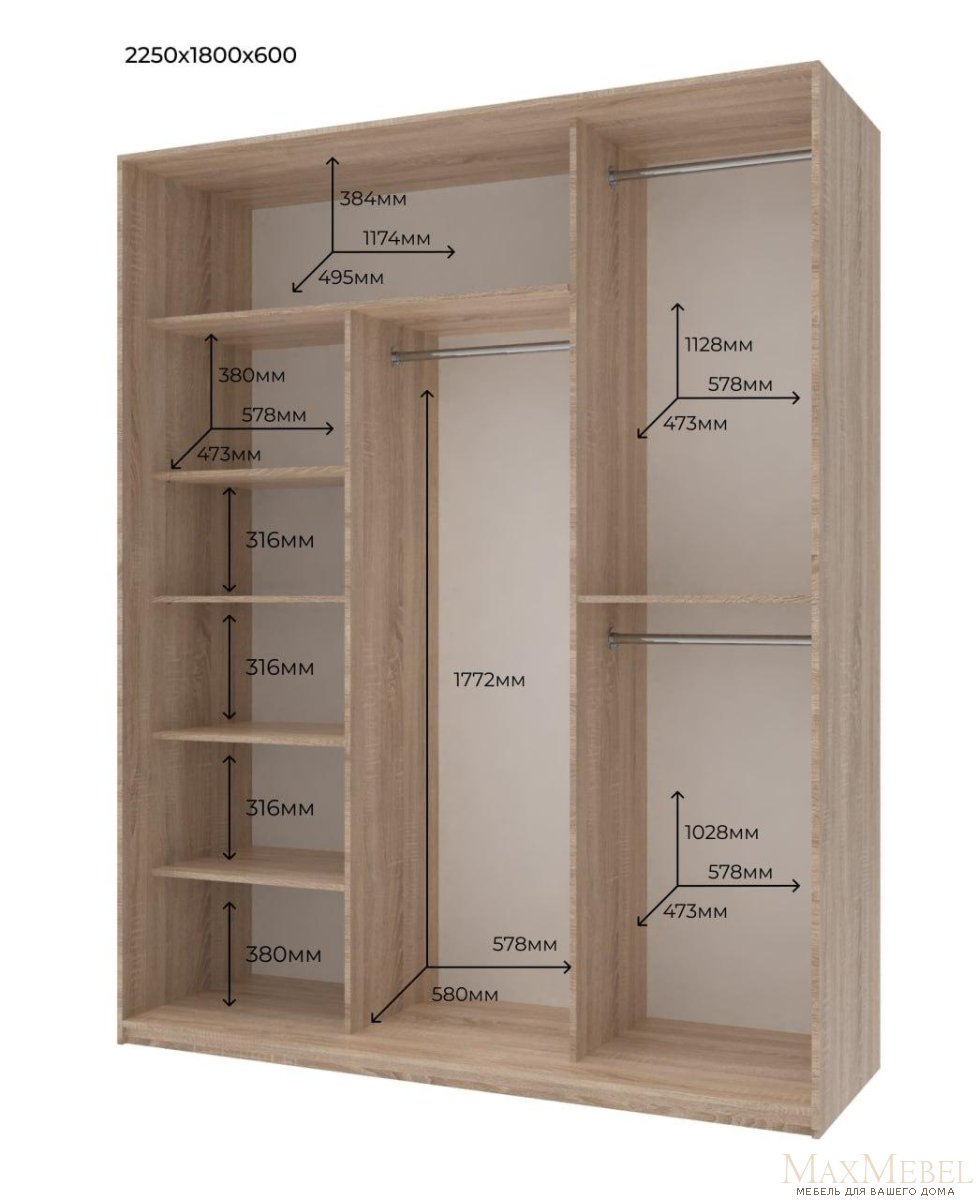 Кількість розсувних дверей: 3 Матеріал розсувної системи: алюміній Декор фасаду: ЛДСП Колір (відтінок) меблів: Дуб сонома Гарантійний термін, міс: 18 Стан: Новий Корпус: ламінована ДСП Двері: ДСП ламінована Задня стінка: ДВП Декоративні елементи: ламінована ДСП Довжина шафи-купе, мм: 1800 Глибина шафи-купе, мм: 600 Висота шафи-купе, мм: 2250 Полиці для білизни (білизняний відділ): Так Штанга для одягу, шт: 3 «Сіті Лайт» — презентує собою серію стильних шаф-купе. Колекція пропонує сучасний дизайн та функціональність для вашої оселі. Кожна шафа «Сіті Лайт» відрізняється плавними лініями та лаконічним зовнішнім виглядом, завдяки чому вона ідеально підійде до будь- якого сучасного інтер’єру. Шафи-купе виготовляються у таких розмірах: 120х45х225, 120х60х225, 150х45х225, 150х60х225, 180х60х225, 225х60х225. Шафи виготовляються у двух кольорах корпусу та фасадів: дуб сонома та біле дерево. Гарантія: 18 місяців. За бажанням є додаткова комплектація шаф шухлядками для одягу та зовнішнім кутовим закінченням у колір корпусу шафи. Корпус і фасад виробу виготовлений з ламінованого ДСП товщиною 16 мм. Кромка фасадних частин звонішніх деталей — 2 мм. Кромка внутрішніх деталей, полиць — 0.5 мм. Шафи спроектовані таким чином, щоб забезпечити міцну, безпечну і стійку конструкцію. Фурнітура проходить перевірку на міцність і довговічність Країна походження фурнітури — Україна. Верхняя направляюча, система фасадів и профіль ручка — алюміній. Всі вироби проходять перевірку на міцність та довговічність Зберігайте упаковку до повного складання виробу, оскільки її наявність є обов'язковою умовою для прийняття рекламацій по товару.