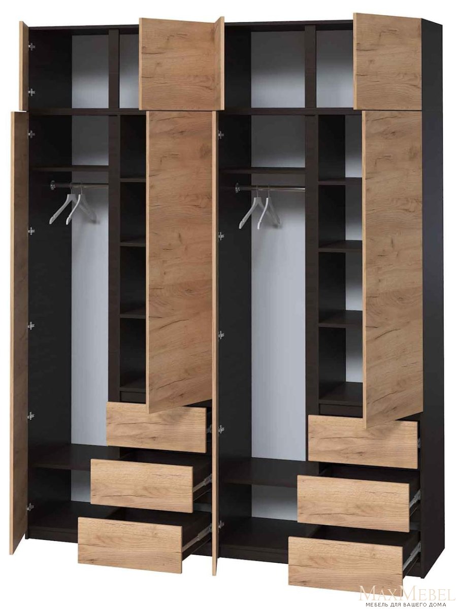Висота шафи, мм: 2400 Глибина шафи, мм: 520 Кількість зовнішніх висувних ящиків, шт: 6 Кількість дзеркал, шт: 1 Кількість стулок (дверей), шт: 8 Наявність дзеркала: на зовнішній стороні фасаду Стан: Новий Тип напрямних для висувних ящиків: Телескопічні (кулькові) Фасади: ламінована ДСП Ширина шафи, мм: 2000 Штанга для одягу, шт: 2 Вага, кг: 237 Корпус (каркас): ламінована ДСП Матеріал корпусу: Ламінована ДСП Призначення: Для дому Тип меблів: шафа > Колір: Венге магія / Дуб крафт золотий Придбайте цю стильну та сучасну шафу - ідеальне поєднання стилю та функціональності!Сучасна шафа з дзеркалом та антресоллю з ламінованого ДСП - стане стандартним рішенням для зберігання одягу та речей. Строгий дизайн без ручок надає меблям мінімалістичний вигляд, а компактні розміри дозволяють вписати шафу в будь-який простір. Надійні конструкції та внутрішні відділення роблять його ідеальним для акуратного зберігання особистих речей, при цьому він легко поєднується з будь-яким інтер'єром, додаючи гармонії та порядку. Характеристики: Особливості:
