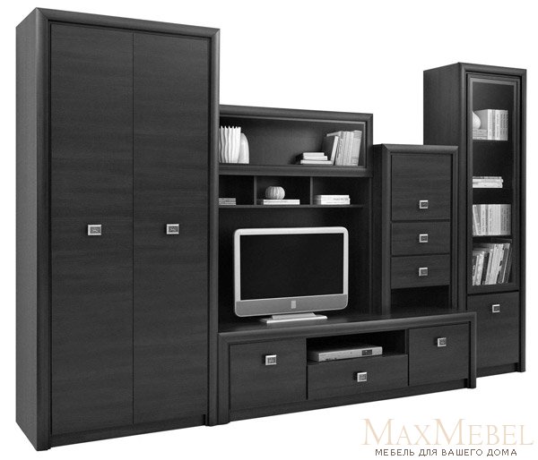Стінка Петіо - прості геометричні форми, мінімум декору, стильна однотонна колірна гама "Венге", невеликі квадратні металеві ручки, що красуються на темних фасадах. Отут усе націлене на максимальну функціональність, що дозволяє найбільше раціонально використовувати вільний простір, і при цьому стінка від фабрики "Гербор Холдинг" відрізняється індивідуальністю дизайном, що й запам'ятовується. матеріал корпуса : ДСП